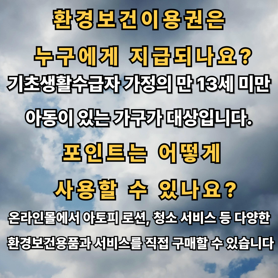 단순 현금성 지원이 아니라 온라인몰에서 직접 필요한 제품을 구매하거나 환경 진단·청소·공사 등 맞춤형 서비스를 받을 수 있어 실효성이 높다는 평가가 이어집니다. 오늘은 실제로 환경보건이용권 포인트를 활용하는 과정과 신청방법, 효과적인 활용 팁까지 총정리해, 건강하고 쾌적한 생활환경을 꿈꾸는 모든 가정에 도움이 되는 정보를 전해드립니다.