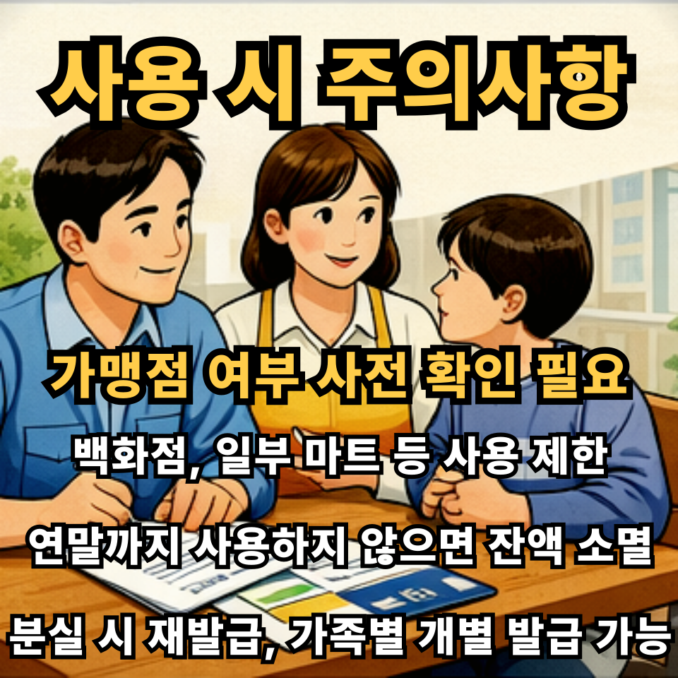 단, 합산을 선택하면 각자의 카드는 발급만 되고 결제는 대표자 카드로만 가능합니다. 일부 지자체에서만 시행되니, 신청 전 꼭 해당 주민센터에서 안내를 확인해야 하며, 필요하다면 기존대로 각자 카드로 개별 결제를 선택할 수도 있습니다. 가족합산은 대형 지출이나 가족 체험에 유리하며, 잔액 및 내역도 대표자가 한눈에 관리할 수 있습니다.