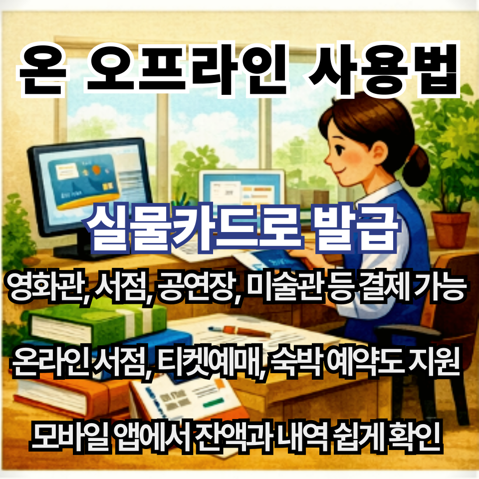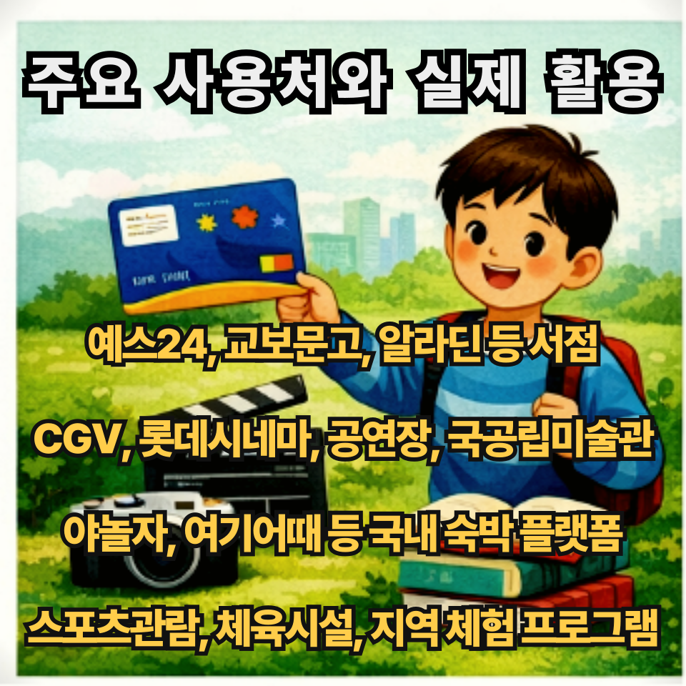 카드는 실물 형태로 발급되며, 오프라인과 온라인 양쪽 모두에서 활용 가능합니다. 영화관(CGV, 롯데시네마, 메가박스), 공연장, 박물관, 미술관, 국립·시립 전시공간, 예스24·교보문고·알라딘 등 주요 서점, 인터파크·옥션·G마켓·네이버예약과 같은 온라인몰, 야놀자·여기어때 등 숙박플랫폼, 펜션·캠핑장·리조트, 그리고 각종 체육시설까지 지원처가 다양합니다.