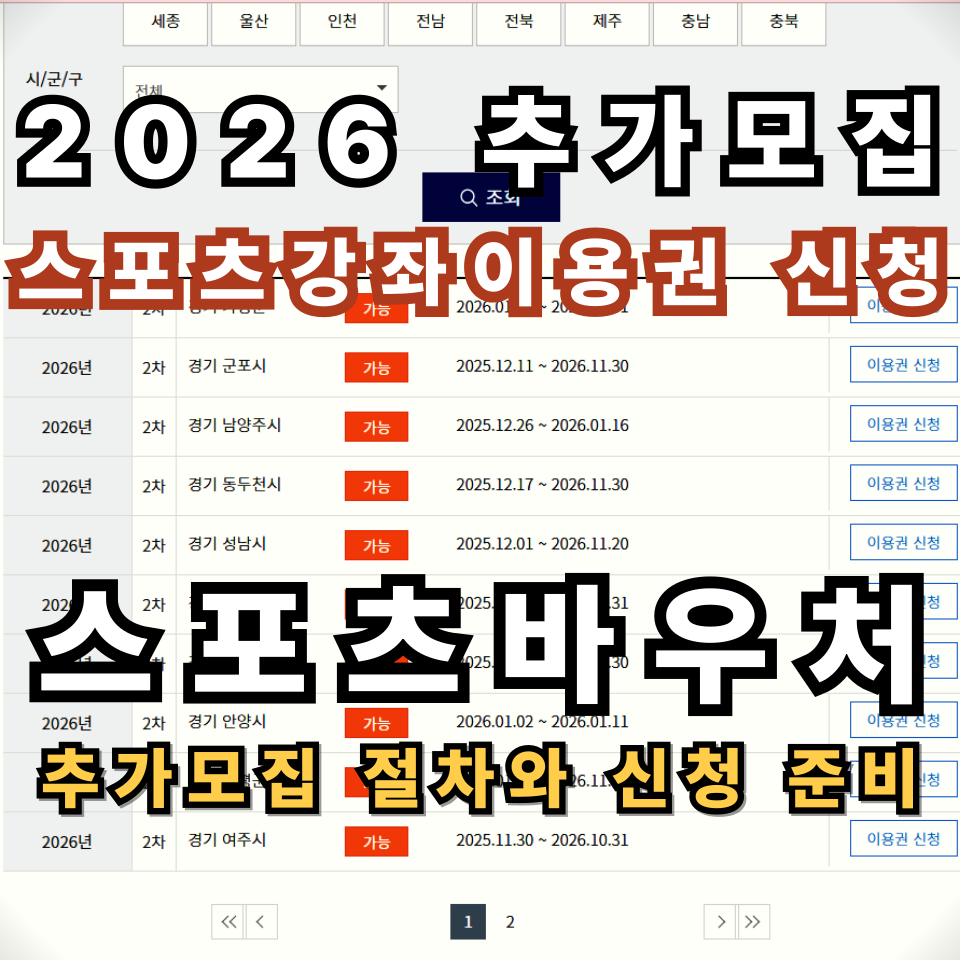 추가모집 시점과 방식은 각 시군구 예산 및 정책 방침에 따라 상이하니, 자신이 사는 지역의 시군구청 누리집, 읍면동 행정복지센터, 스포츠강좌이용권 공식 사이트, 국민체육진흥공단 공고를 꼭 확인해야 합니다.