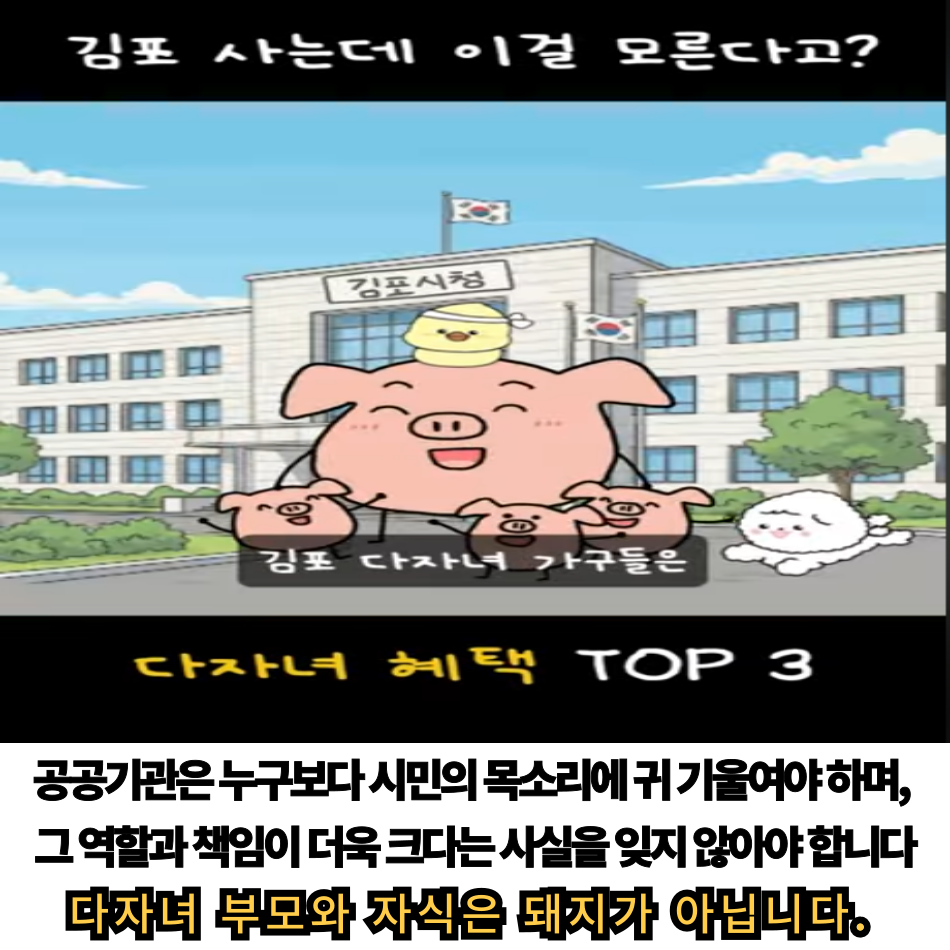 최근 공개된 김포시 공식 유튜브 영상도, 다자녀 가족을 위한 복지 정책을 널리 알리고자 만든 콘텐츠였습니다.