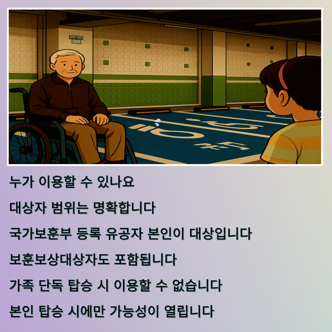 사용 대상은 국가보훈부에 등록된 국가유공자 본인입니다. 보훈보상대상자, 전몰군경 유족, 5·18민주유공자, 특수임무수행 유공자 등도 포함됩니다. 중요한 것은 반드시 본인이 탑승한 상태여야 한다는 점입니다.