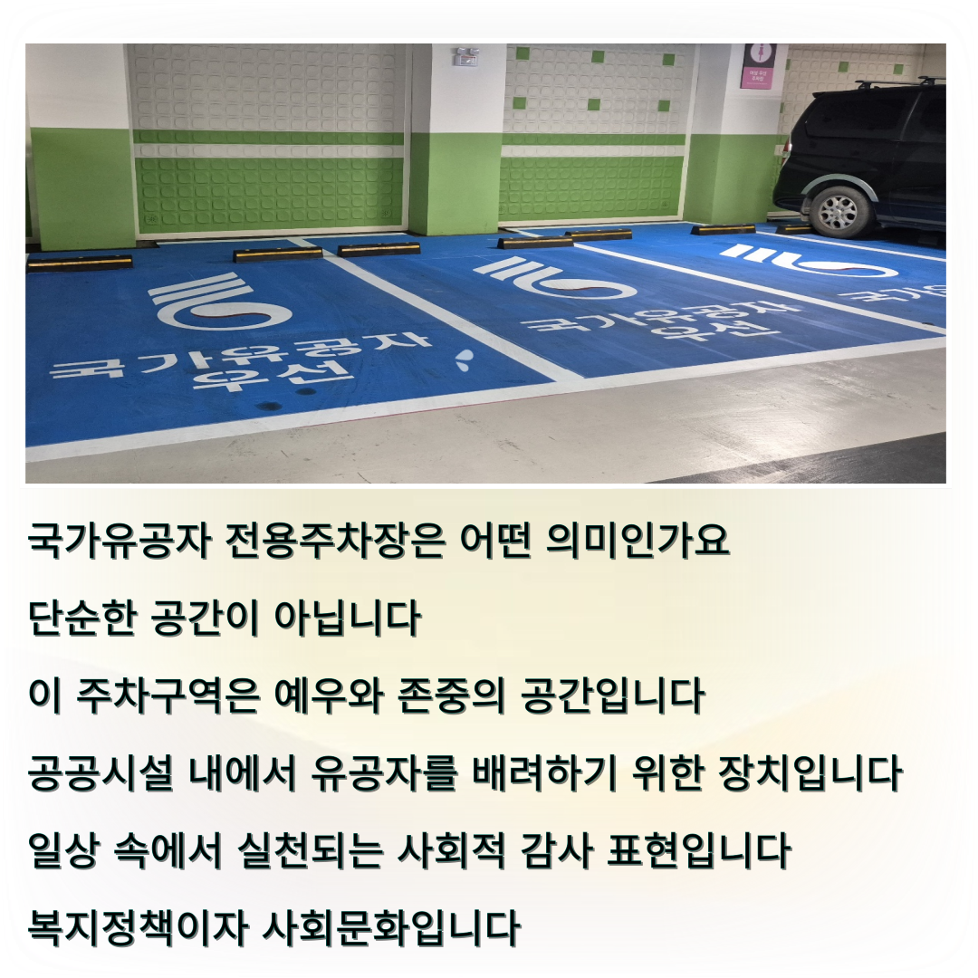 국가유공자 전용주차장은 예우와 배려의 상징이며, 제도의 핵심은 강제보다는 존중입니다.