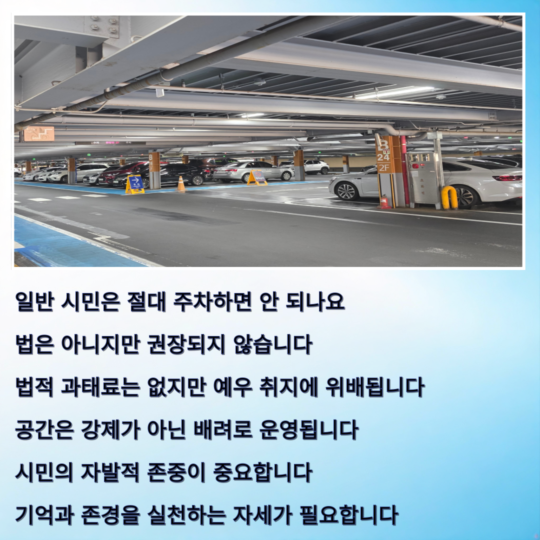 따라서 일반 시민이 주차하지 말아야 할 법적 의무는 없지만, 그 공간이 갖는 상징성과 목적을 존중한다면 자발적인 양보가 요구됩니다.