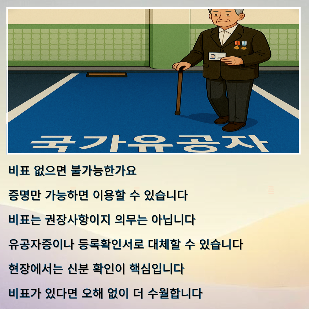 사용 대상은 국가보훈부에 등록된 유공자 본인이며, 차량 비표가 없어도 신분확인이 가능하면 이용할 수 있습니다.