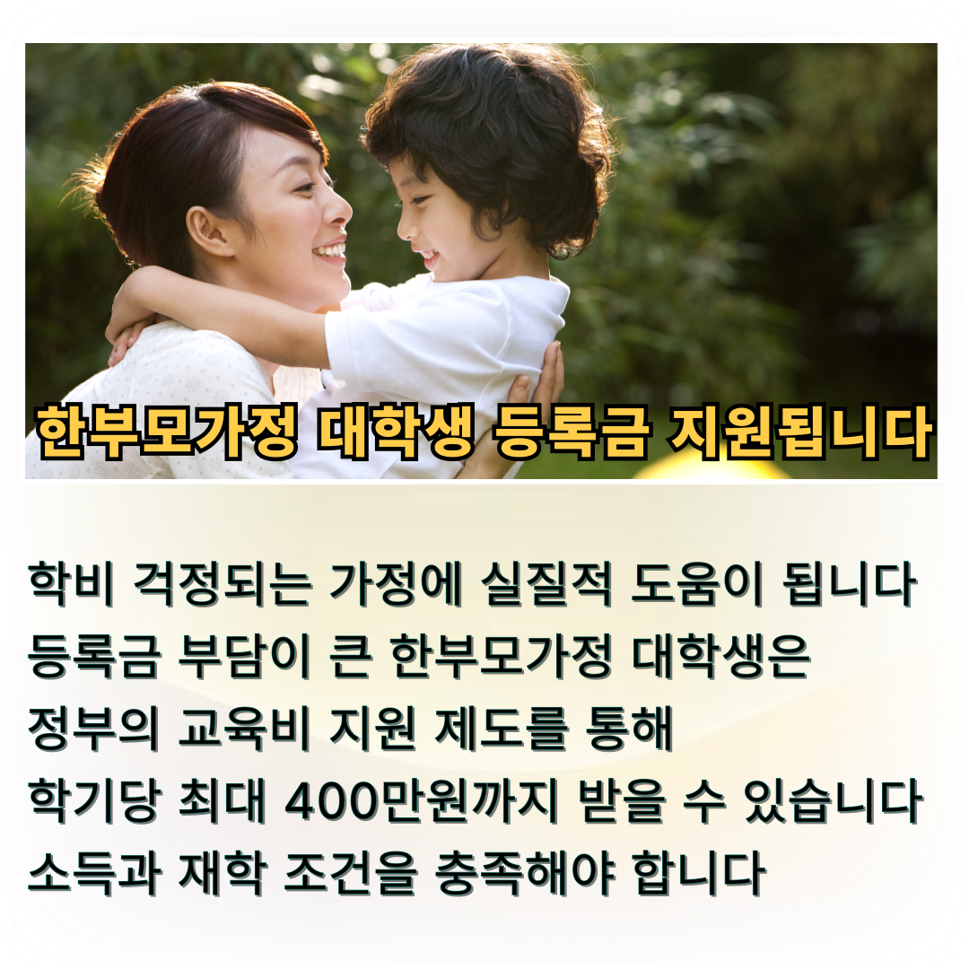 교육은 미래를 위한 투자지만 한부모가정에게 대학 등록금은 단순한 부담이 아닌 생존의 문제로 다가올 수 있습니다 특히 혼자 생계를 책임지는 구조 속에서 수백만 원에 달하는 등록금을 감당하는 것은 현실적으로 쉽지 않습니다 이를 고려해 정부는 한부모가족대학생등록금지원 제도를 통해 대학 진학과 학업 유지에 필요한 등록금을 일정 부분 또는 전액 지원하고 있으며 제도는 소득기준과 성적요건 가족 형태 등에 따라 신청 자격이 달라집니다