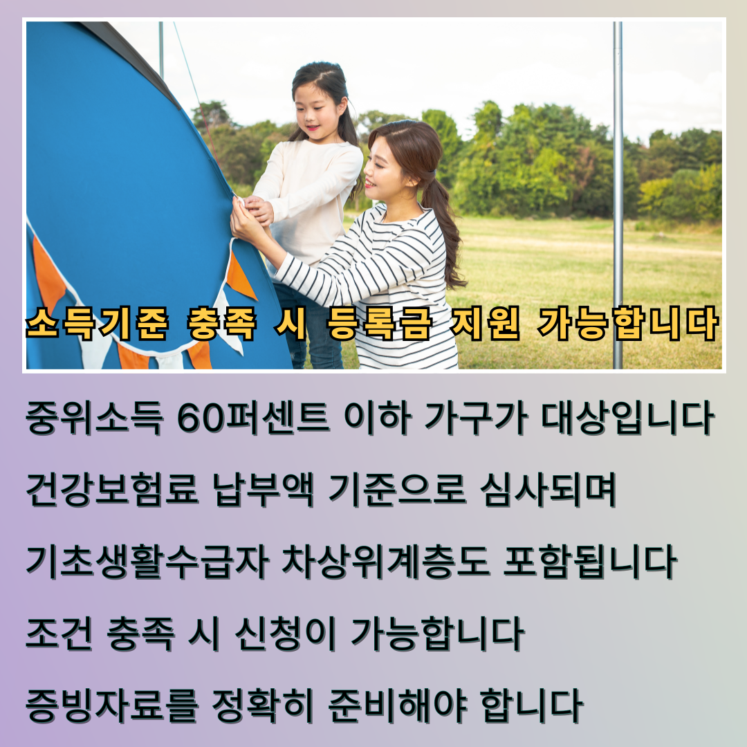 둘째, 소득 요건을 충족해야 합니다. 기준 중위소득 60퍼센트 이하인 가구가 대상이며 이는 건강보험료 납부액 또는 국민기초생활보장제도의 수급 여부로 확인됩니다.