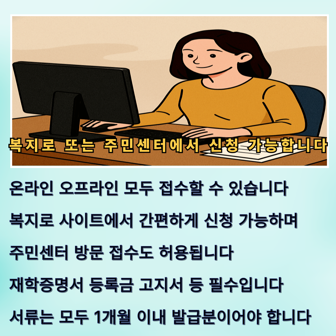 신청 시 구비해야 할 서류는 자녀 재학증명서, 가족관계증명서, 등록금 고지서, 소득증명자료, 건강보험자격확인서 등이 있으며 모든 서류는 최근 1개월 이내 발급된 것이어야 하며 서류 누락 시 자동으로 심사 제외됩니다.