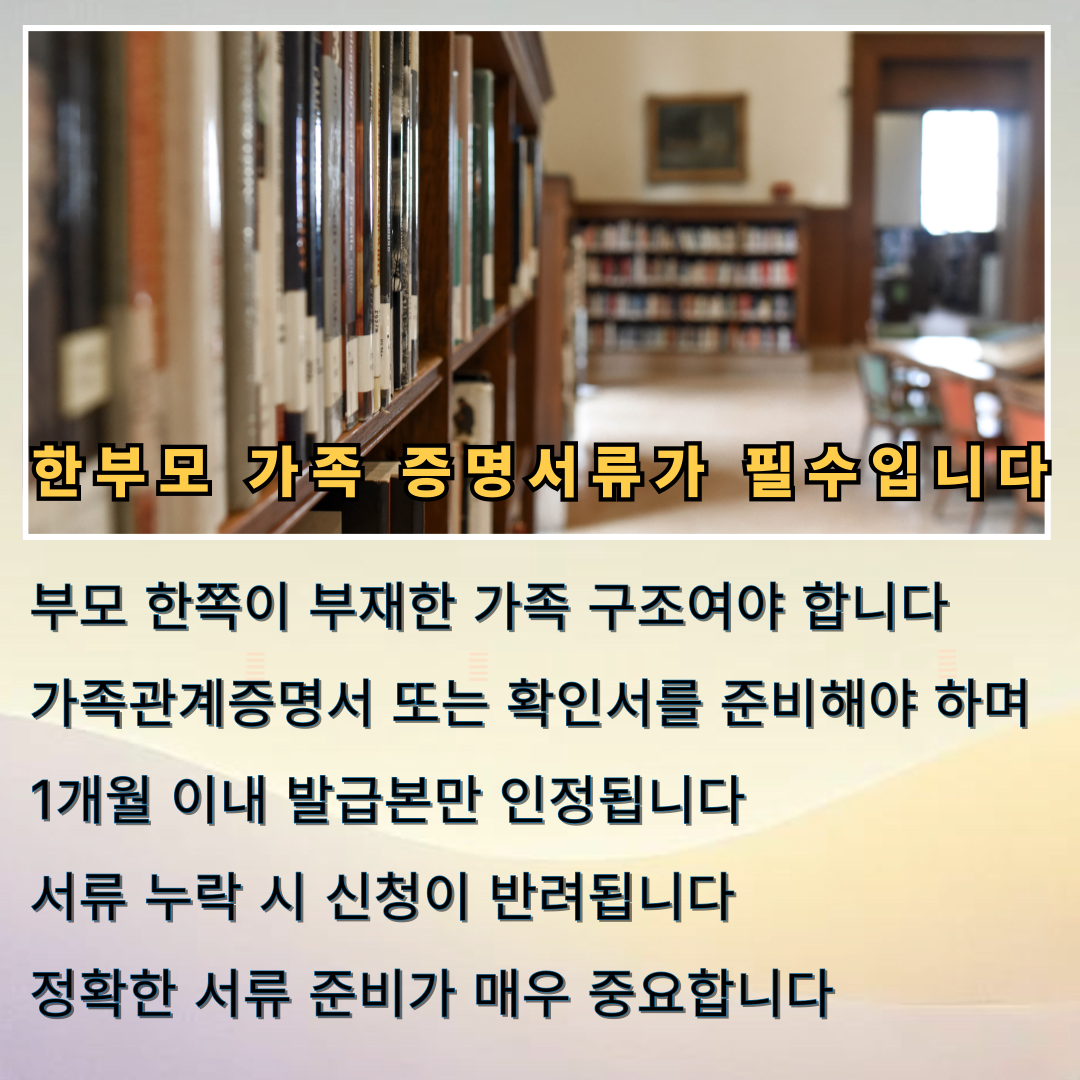 첫째, 한부모가족임을 증명할 수 있어야 합니다. 부 또는 모 중 한 명이 부재한 상태에서 자녀를 단독으로 양육하는 가족 구조여야 하며 가족관계증명서 또는 한부모가정 확인서 등을 통해 이를 입증할 수 있어야 합니다.