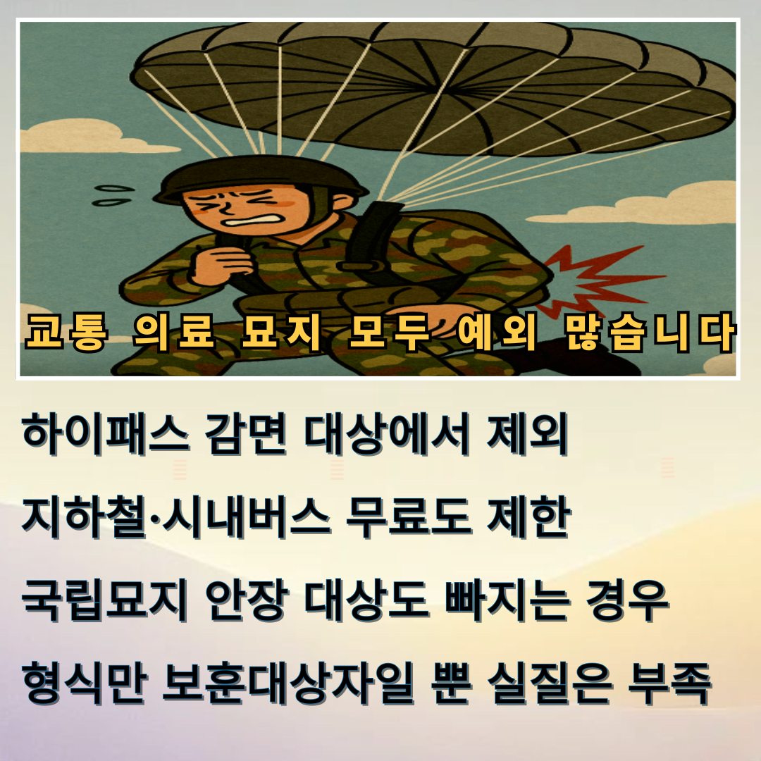 교통 분야에서도 차별은 명확히 드러납니다. 국가유공자는 대부분 지역에서 하이패스 자동 감면, 지하철·버스 요금 면제 등의 혜택을 받습니다.