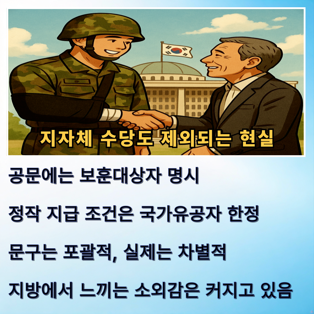 이런 차별은 지자체 수당에서도 반복됩니다. 여러 지방자치단체에서는 ‘보훈대상자 수당’을 지급한다고 홍보하지만, 실제 지급 조건을 보면 국가유공자로 한정하는 경우가 많습니다.공문상으로는 보훈대상자 전체를 아우르는 듯하지만, 보훈보상대상자는 현실적으로 배제되는 사례가 다수입니다.