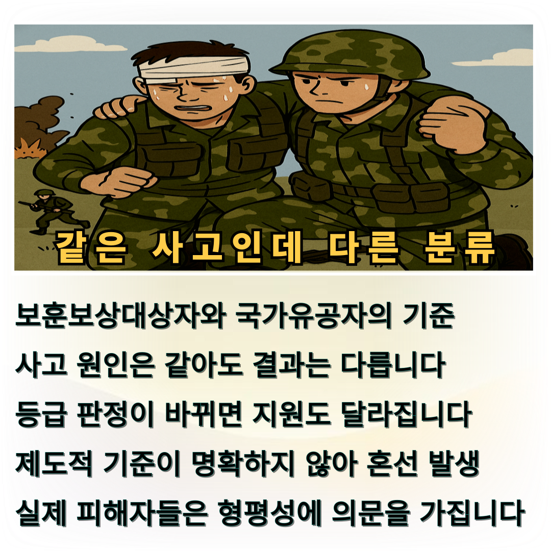 군 복무 중 동일한 사고를 겪었음에도 누구는 국가유공자로 등록되어 다양한 지원을 받는 반면, 누구는 보훈보상대상자로 분류되어 제한적 혜택만 누리는 상황은 제도의 형평성을 무너뜨리고 있습니다.