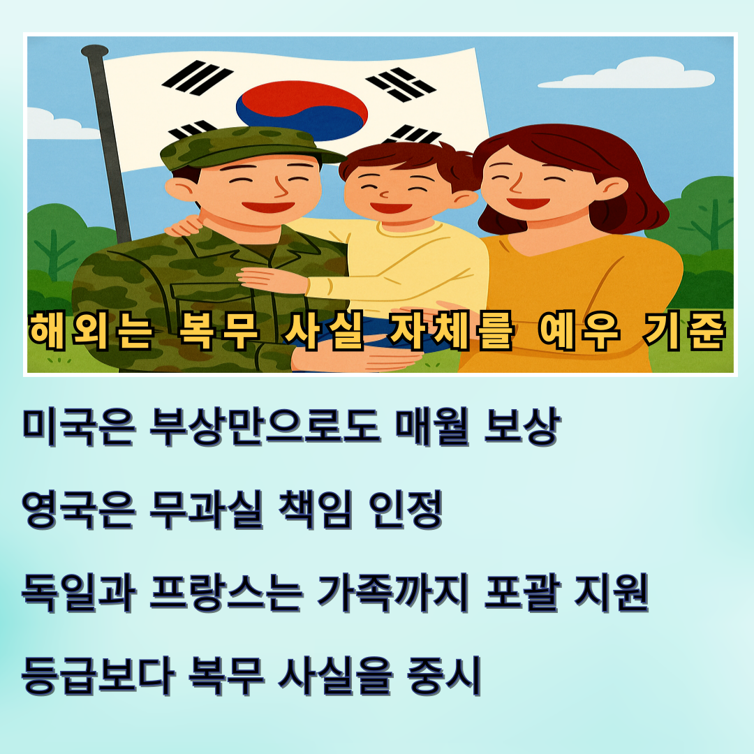 미국은 부상 정도와 부양가족 여부에 따라 월 175달러에서 3,800달러 이상까지 차등 보상금을 지급합니다.의료, 주거, 교육, 고용 등 전 영역에서 국가가 전담하여 보훈대상자의 삶을 책임지는 구조입니다.