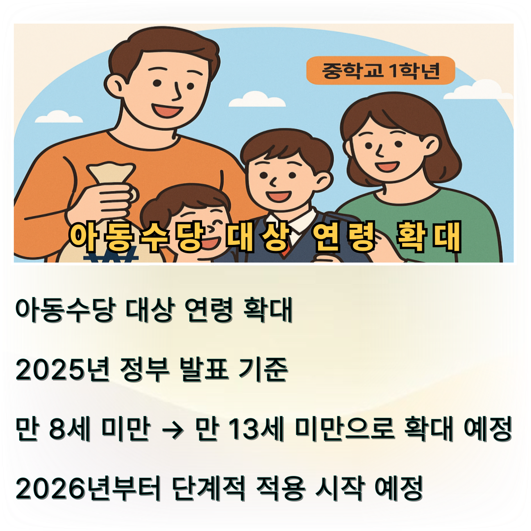 2025년 8월 22일 정부는 아동수당 정책의 핵심 구조를 개편하는 계획을 발표했습니다. 기존에는 만 8세 미만 아동만을 대상으로 했던 수당 지급 대상이 점차적으로 만 13세 미만까지 확대됩니다.