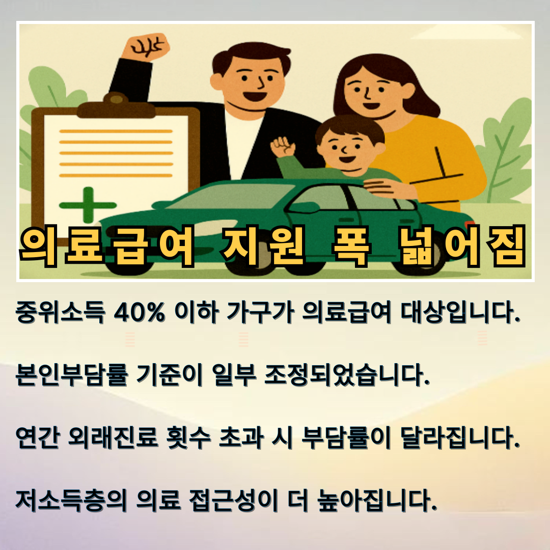 의료급여는 중위소득 40% 이하 가구를 대상으로 하며, 진료비 부담을 크게 줄여주는 복지정책입니다. 최근 정부는 고령화와 만성질환자 증가에 대응하기 위해 의료급여 지원의 폭을 확대하고 있습니다.