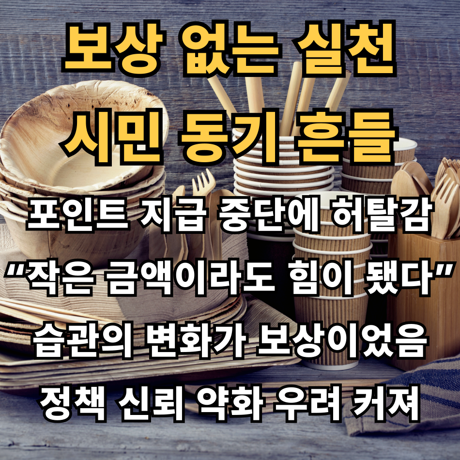 하지만 지급 중단으로 인해 “포인트는 적어도 실천의 동기였다”, “예고 없이 중단돼 정책에 대한 신뢰가 떨어진다”는 아쉬움이 커지고 있습니다. 특히 정책의 안정적 운영과 충분한 사전 안내 부족, 반복적인 중단 사태가 시민의 신뢰를 약화시키는 핵심 요인으로 지적되고 있습니다.